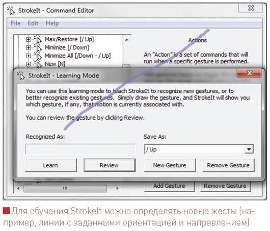 Первым делом установите на компьютер бесплатный инструмент StrokeIt (find.pcworld.com/71656). Запустите его, и на Панели задач в правом нижнем углу экрана появится значок в виде указателя мыши. Нажмите в любом месте экрана правую кнопку мыши и поводите мышью в разные стороны. Указатель мыши будет выполнять роль цифрового пера; StrokeIt анализирует его перемещения и сравнивает с предопределенными жестами.