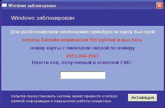 Для избавления от мытарств бедолагам предлагались различные варианты оплаты в обмен на ключ для разблокировки компьютера: от перечисления нескольких сотен рублей на электронный кошелек платежных систем до отправки SMS на короткий номер. Разумеется, расставшись со своими кровными, страдальцы, что называется, оставались с носом, а кое-кому из них приходилось дополнительно раскошеливаться на услуги толкового специалиста.