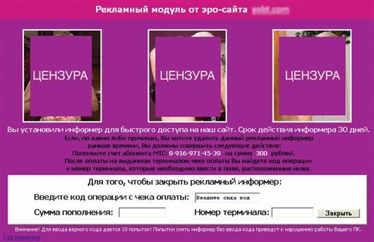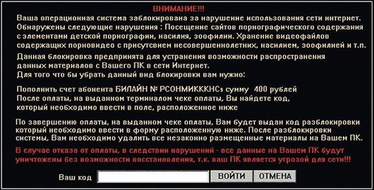 Семейство данных зловредов велико, и не все блокировщики напрочь парализовывали работу компьютера -- в некоторых случаях интернет-соединение оставалось работоспособным, что позволяло сведущим людям уничтожить врага в течение короткого времени. Что касается содержания баннеров, то, как правило, грозные надписи так или иначе были связаны с порнографической тематикой. Добропорядочные граждане начинали понимать, что дело нечисто, и поступали правильно, обращаясь за помощью к специалистам.
