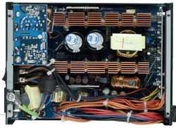 Внутренности блока, как уже упоминалось, произведены компанией AcBell. Предусмотрены два радиатора: один -- в низковольтной части, на нем закреплены полупроводниковые выпрямители, другой -- в высоковольтной, он отводит тепло от силовых ключей в составе высокочастотного генератора, а также активного PFC. Стоит отметить, что на этикетке блока нет ни слова о сертификации 80 PLUS, хотя на сайте у обеих моделей (на 900 и на 1200 Вт) красуется значок 80 PLUS Silver. Видимо, образец был отправлен нам до окончания процедуры сертификации.