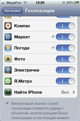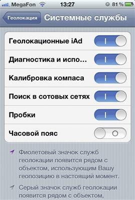 Сервисы определения местоположения можно полностью отключить, перейдя в меню Settings/Location Services и установив переключатель Location Services Switch в положение Off. Но это крайняя мера, которую все-таки лучше избегать. Пролистайте список приложений и выясните, какие из программ в настоящее время используют эти сервисы (они обозначены пурпурной стрелкой). Нужно ли, чтобы данные приложения транслировали информацию о вашем местоположении? Если нет, отключите их.