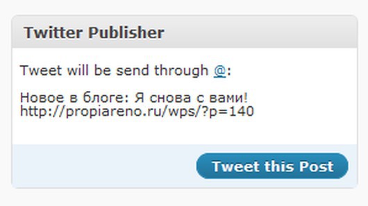 Большинство плагинов, предназначенных для публикации в Twitter анонсов записей блога, имеют схожую возможность настроить шаблон твита (указать название записи, ссылку на нее, дату, автора и т.д.) и поддержку сервисов сокращения URL. В результате твит будет выглядеть приблизительно так: «Новое в блоге: О стартапах. Вступление http://propiareno.ru/wps/?p=119».