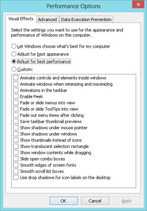 | Отключение излишних графических эффектов в Windows 8 минимизирует объем используемой памяти и способствует ускорению отклика ОС на действия пользователя |