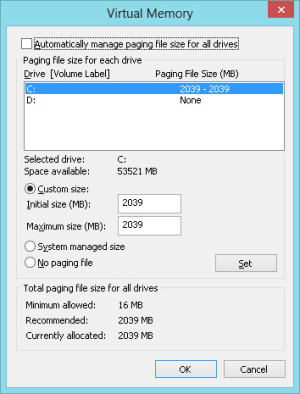 Чтобы определить размер файла подкачки в Windows 8, установите переключатель в центральной части панели Virtual Memory в положение Custom Size и укажите в полях Initial Size и Maximum Size рекомендуемый размер страницы в мегабайтах. Нажмите кнопку Set, затем OK и еще раз OK, чтобы закрыть окно Performance Options. Нажмите OK в окне System Properties и, если потребуется, перезагрузите компьютер, но на практике без этого обычно удается обойтись.