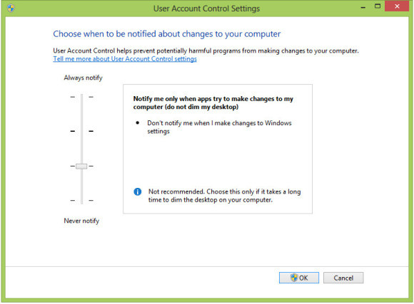 Эта рекомендация, возможно, не понравится ветеранам, управляющим многочисленными системами, на которых работают другие менее подготовленные пользователи. Но если вы настраиваете свой собственный персональный компьютер, проблем возникнуть не должно. Каждый раз, когда система контроля учетных записей пользователей (User Account Control, UAC) выдает очередное предупреждение, это приводит не только к приостановке работы системы, замирающей в ожидании реакции пользователя, но и к затемнению экрана. А эта операция на старом оборудовании может длиться очень долго. Полное отключение уведомлений UAC позволяет существенно повысить производительность системы Windows 8, установленной на старом оборудовании. Кроме того, поддерживается возможность снижения уровня предупреждений. Это минимизирует число отображаемых на экране предупреждающих сообщений и вместе с тем позволяет сохранить определенную защиту.