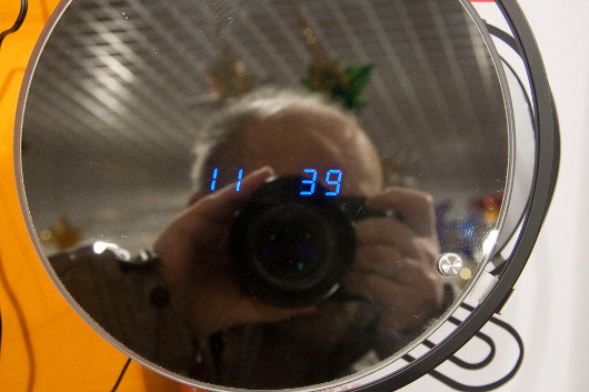 С часами в LeFutur всегда было хорошо, некоторые из них не сходят с прилавков годами. Вот, к примеру, «Время любви». Собственно время на них отображается на молниеносно раскачивающихся спицах, туда же можно вставить до трех сообщений — что-то вроде признания в любви. Светящиеся буквы и цифры, парящие и мерцающие прямо в воздухе, завораживают меня от раза к разу все больше — просто не оторваться. И сфотографировать не удается: затвор выхватывает лишь одно мгновение. Вон оно, слева наверху…