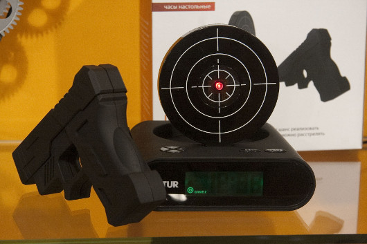 Еще одни часы, будильник, который я тоже не могу обойти вниманием. Вроде бы часы как часы. Стандартные цифровые. Однако над ними поднимается мишень. И пока вы не попадете в ее центр из цифрового же пистолета, будильник будет вас донимать. Проснетесь обязательно. В принципе, можно и просто поиграть…