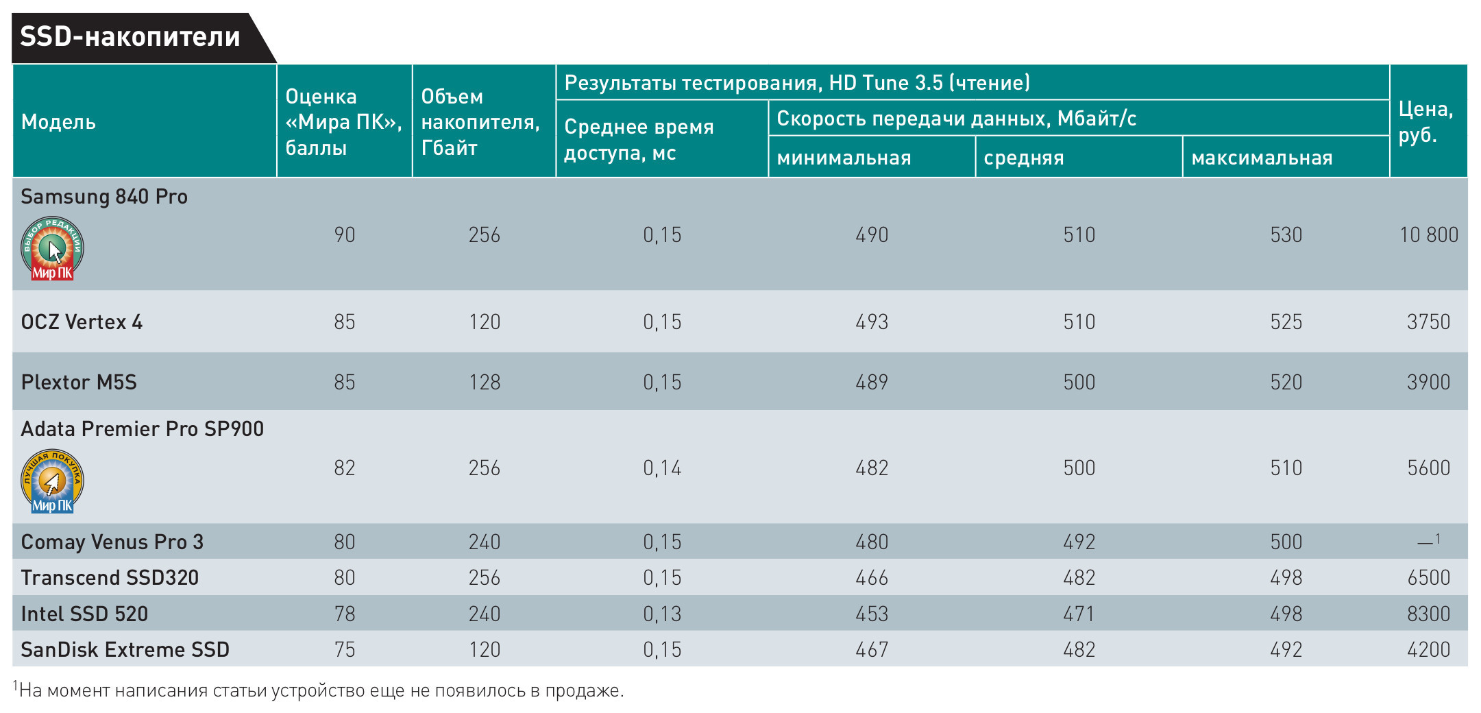 По итогам наших испытаний «Выбор редакции» пал на SSD-диск Samsung 840 Pro, обладающий отличными скоростными показателями, тогда как «Лучшей покупкой» мы посчитали Adata Premier Pro SP900, у которого стоимость единицы хранения информации оказалась ниаменьшей.