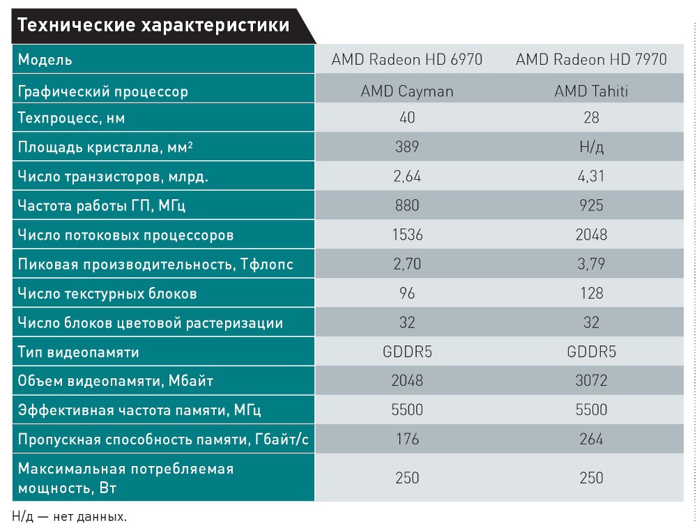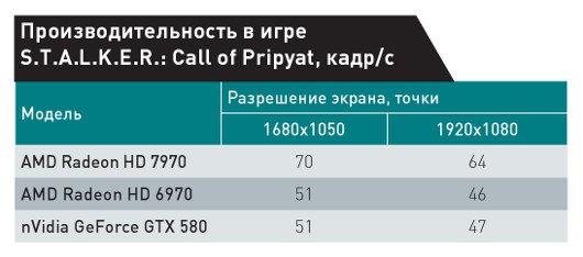 Прирост производительности в играх по сравнению с 6970 составляет не меньше 25%, а в большинстве тестов он еще выше. GeForce GTX 580 также остался за бортом. Правда, стоит учесть, что цена новинки довольно велика -- 550 долл. Она чуть выше реальных цен на начало января этого года на GeForce GTX 580 с 1,5 Гбайт памяти, но меньше, чем стоит 3-Гбайт версия. Цены на Radeon HD 6970 еще ниже: они начинаются всего с 11 тыс. руб. Так что, если 7970 действительно появится в российской рознице по цене около 17 тыс. руб., то по соотношению цена/качество она будет заметно проигрывать своей предшественнице.