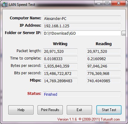 Программа показывает результаты записи на диск (эквивалент скорости загрузки данных из Сети и чтения с диска (эквивалент скорости передачи данных в Сеть). Чтобы получить реальную картину скорости соединения, желательно запускать тест по нескольку раз в день. Благодаря LAN Speed Test сетевые администраторы и дотошные домашние пользователи смогут выяснить, в какое время их Сеть подвержена наиболее сильным заторам.