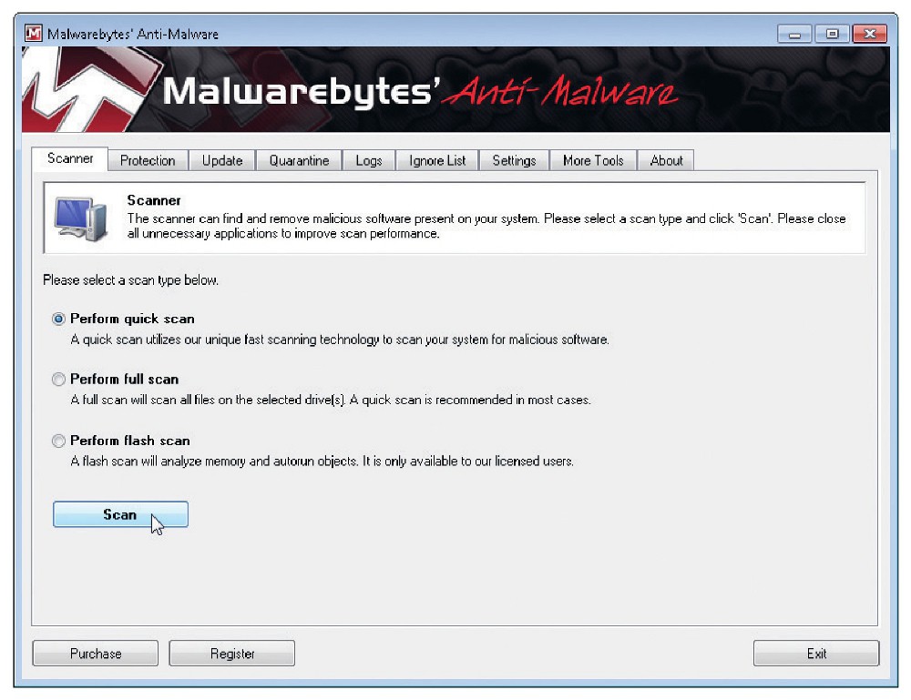 Если вы полагаете, что ваш ПК заражен, я рекомендовал бы сначала воспользоваться сканером, выполняемым по запросу, а затем уже запустить монитор. Среди бесплатных сканеров высокого качества стоит отметить приложения BitDefender Free Edition, Kaspersky Virus Removal Tool, Malwarebytes, Norman Malware Cleaner и SuperAntiSpyware. Мы воспользуемся программой Malwarebytes. Если у вас нет доступа к Интернету или программа Malwarebytes не загружается на зараженный ПК, скачайте ее на какой-нибудь другой компьютер, а затем перепишите на флеш-диск с интерфейсом USB.