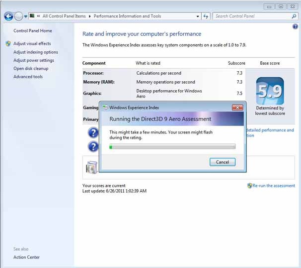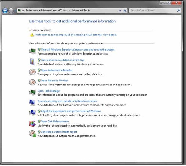 Сначала обратитесь к разделу «Счетчики и средства производительности» в меню Панели управления Windows. Перейдя по ссылке «Дополнительные инструменты», вы увидите перечень всех утилит операционной системы, связанных с вопросами, касающимися производительности. Чтобы сравнить нынешнюю скорость работы Windows с быстродействием, зарегистрированным после первоначальной установки системы, запустите еще раз процедуру расчета индекса производительности Windows.