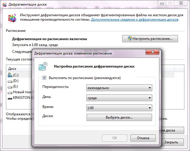 3. Никогда не выполняйте дефрагментацию твердотельного диска. Это приведет к сокращению срока его службы. Если в компьютере установлен твердотельный диск, автоматическую дефрагментацию в Windows 7 необходимо отключить. Нажмите кнопку «Пуск», наберите в поисковой строке «дефрагментация диска» и запустите одноименную утилиту. Чтобы отключить автоматический запуск, нажмите кнопку «Настроить расписание».