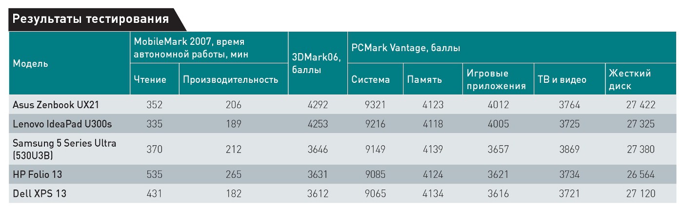 При подведении итогов данного тестирования мы решили отступить от привычной системы оценок, приоритетом которой всегда была производительность. Дело в том, что в данном случае нас интересовали не игровые возможности ультрабуков, обсуждать которые пока еще не приходится, а скорее максимальная функциональность при минимальной массе. Ведь пользователь, приобретая ультрапортативный ПК, редко планирует использовать его в качестве замены настольного компьютера. Как правило, такие аппараты покупают, чтобы постоянно носить с собой, причем зачастую на собственном плече. Именно поэтому «Выбор редакции» пал на миниатюрный Asus Zenbook UX21, а вот «Лучшей покупкой» мы посчитали Samsung 5 Series Ultra (530U3B) -- несмотря на отдельные недостатки, этот ноутбук обладает отличной функциональностью при весьма привлекательной цене.