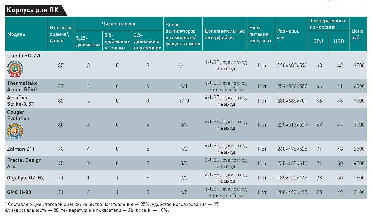 Для проведения испытаний в каждой из моделей была собрана система, состоящая из процессора Intel Core i5 2500K со штатным охладителем, системной платы ASRock Z68 Extreme 4, 4-Гбайт ОЗУ типа DDR3, 640-Гбайт жесткого диска Western Digital, блока питания Enermax Revolution на 840 Вт. При их оценке учитывались качество исполнения и удобство сборки. Кроме того, были проведены температурные исследования.