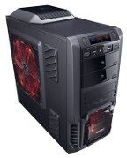 Компания Aerocool всегда творчески подходила к созданию своих корпусов. Правда, данная модель в полноформатном башенном исполнении получилась довольно громоздкой и тяжелой. Ее дизайн, в общем-то, неплох, он явно способен привлечь любителей игр. В базовой комплектации предусмотрены три больших и тихих вентилятора. Немного поразило количество свободных посадочных мест. Так, на левую боковую стенку можно установить один 12-см вентилятор, а вот на правую — либо девять такого же размера, либо один 20-см. Вот только защищающую их сетку не мешало бы закрепить получше.
