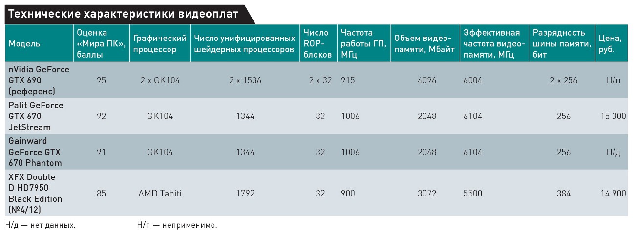 Плату XFX Double D HD7950 Black Edition мы оценили ниже, чем GTX 670, в соответствии с результатами тестирования, однако стоит заметить, что цены на Radeon HD 7950 от других производителей сейчас начинаются от 12 000 руб., и за такие деньги производительность Radeon HD 7950 можно оценить на отлично.