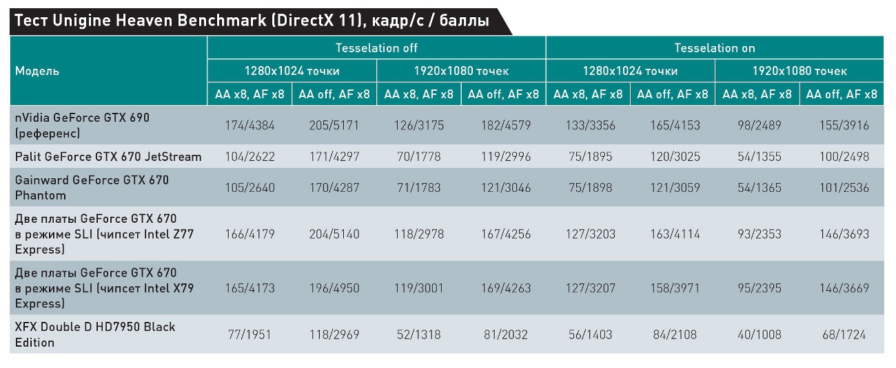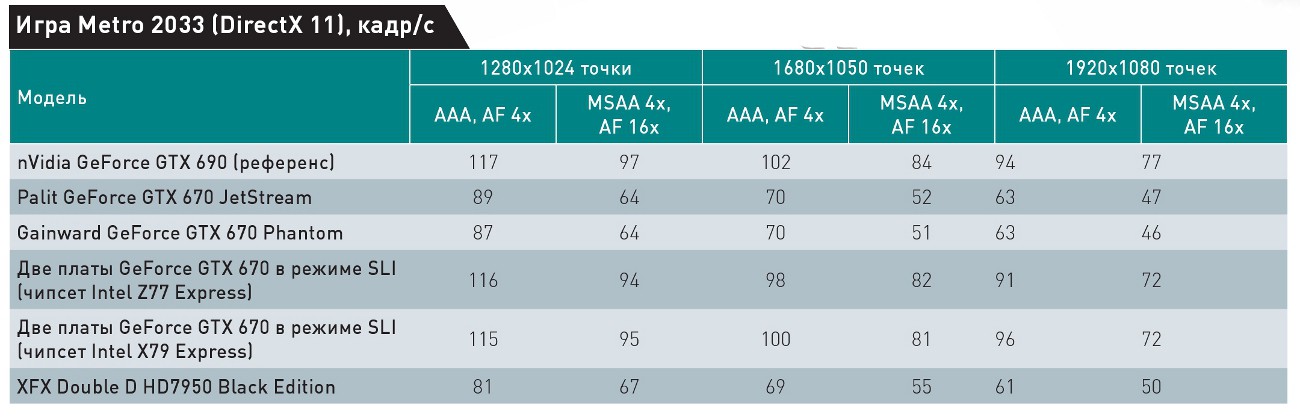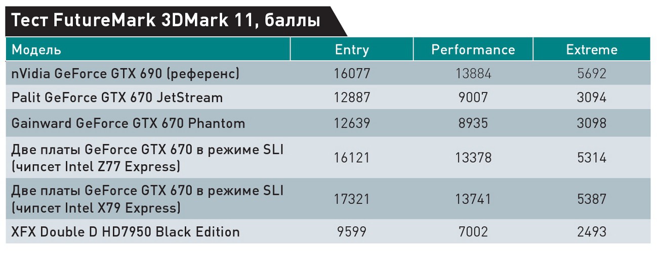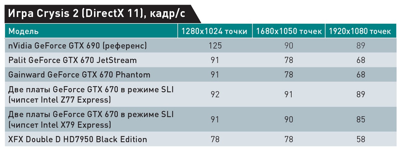 Мы провели испытания с массивом из двух видеоплат GeForce GTX 670 (эталонный образец nVidia + Palit GeForce GTX 670 Jetstream) на системных платах Intel DX79SI и DZ77GA-70K. Вполне ожидаемо, разницы в производительности мы не заметили. Таким образом, предпочтительной платформой для сборки игровой системы сейчас является Intel LGA1155. Тем, кто испытывает непреодолимое желание строить массивы более чем из двух плат или использовать видеоплаты независимо для GPGPU, стоит внимательно выбирать системную плату по отзывам в Интернете и пока применять лишь видеоплаты на ГП производства AMD.