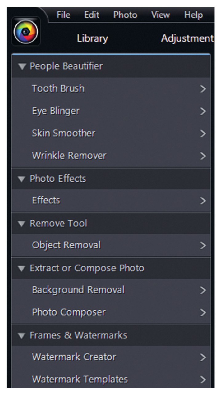 На вкладке Edit находится ряд функций, позволяющих управлять специальными расширениями фоторедактора. В категории People Beautifier, например, расположены инструменты Tooth Brush (белоснежная улыбка), Eye Blinger (сверкание глаз), Skin Smoother (сглаживание кожи) и Wrinkle Remover (удаление морщин). Все инструменты работают достаточно хорошо, но при редактировании желательно все же проявлять осторожность, добиваясь оптимальных результатов путем экспериментирования.