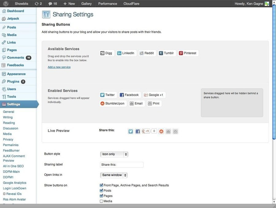 Модуль расширения Social Media Widget помогает справиться с такой задачей. Введите имя пользователя одной из социальных сетей, предлагаемых плагином, который в настоящее время поддерживает около 50 сервисов, включая Facebook, Twitter, Etsy и Pandora. В результате соответствующий значок появится в виджете, размещающемся на навигационной панели. Можно выбрать один из пяти значков, представленных в трех размерах. Поддерживаются также до шести специальных ссылок (например, на Goodreads или Clippings.me), не включенных в значок, предлагаемый по умолчанию.