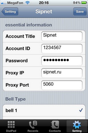 Настройка клиентов для iPhone ничем не отличается от таковой для Android. На рисунке представлено окно настройки программы NetDial: те же поля ввода идентификатора, пароля и сервера.