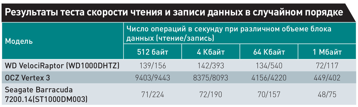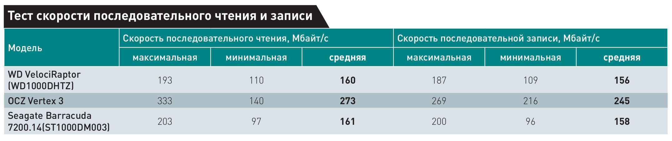 Теперь вспомним о VelociRaptor. Есть ли место этому необычному накопителю среди SSD, демонстрирующих рекорды скорости, и «простых» жестких дисков, имеющих рекордно низкое соотношение цена/емкость? Последнее, шестое по счету поколение VelociRaptor основано на пластинах по 500 Гбайт. Доступны модели емкостью от 250 до 1000 Гбайт. Стоят они примерно в 3 раза дороже, чем широко распространенные винчестеры той же емкости. К нам на тестирование поступила топовая модель VelociRaptor. Мы сравнили показатели ее производительности с ширпотребным жестким диском и с SSD емкостью 480 Гбайт, который можно купить примерно за 15 тыс. руб.
