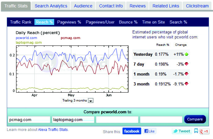 Полученные результаты редко бывают точными, потому что базируются они в основном на отчетах Панели инструментов браузера, которую пользователи предпочитают не устанавливать. К положительным моментам можно отнести то, что Alexa открывает свои данные всем желающим, и их вполне можно использовать для грубой оценки популярности вашего сайта при сравнении с сайтами конкурентов. С помощью стандартного аналитического инструмента такую оценку получить не удастся. Не стоит лишь придавать цифрам слишком большого значения.