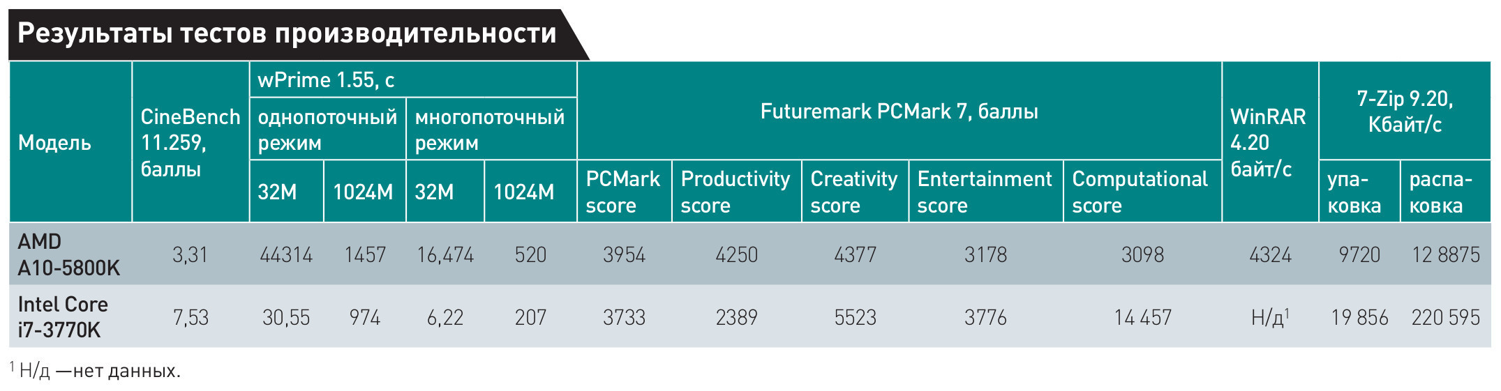 Мы протестировали самый быстрый из доступных процессоров -- четырехъядерник A10-5800K. А для сравнения добавили в таблицу результаты тестирования Ivy Bridge. Стоит учесть, что данная модель процессора Intel стоит почти втрое дороже топового Trinity.