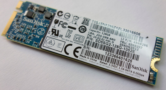 Накопитель SSD установлен не простой, а SanDisk, имеющий объем 128 Гбайт и стандартный интерфейс mSATA. Характеристики у него вполне достойные: скорость чтения -- до 418 Мбайт/с, записи -- до 325 Мбайт/с. Но если будете прицениваться к X1 Carbon, настоятельно рекомендую версию с 256 Гбайт на борту. Конечно, 128 Гбайт – само по себе не густо, а тут еще 13,5 Гбайт кушает служебный раздел, 1,5 Гбайт – скрытый раздел с драйверами и еще 8 Гбайт навсегда отдано под гибернацию…