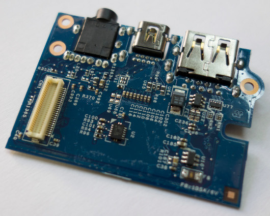 Все разъемы – USB, DisplayPort, наушников, питания – выполнены на отдельных платах. Это усложняет конструкцию, зато существенно облегчает и удешевляет ремонт, если он вдруг потребуется. На большинстве ультрабуков и на MacBook Air в случае сгорания USB-порта надо заменять всю системную плату целиком (или пытаться восстановить порт кустарными методами), а вот здесь можно заменить гораздо более дешевый модуль в считанные секунды. Очень продуманное и дружелюбное к пользователю решение -- за что глубокий респект инженерам Lenovo.