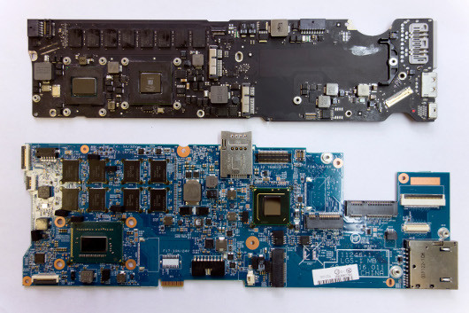 | Материнские платы MacBook Air (вверху) и Lenovo ThinkPad X1 Corbon. Стоит заметить, что у X1 все важные компоненты расположены на одной стороне, и дизайн тыльной части пассивный |