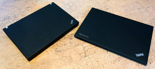 | Справа ThinkPad X201s, на котором еще даже нет логотипа Lenovo, слева -- X1 Carbon |