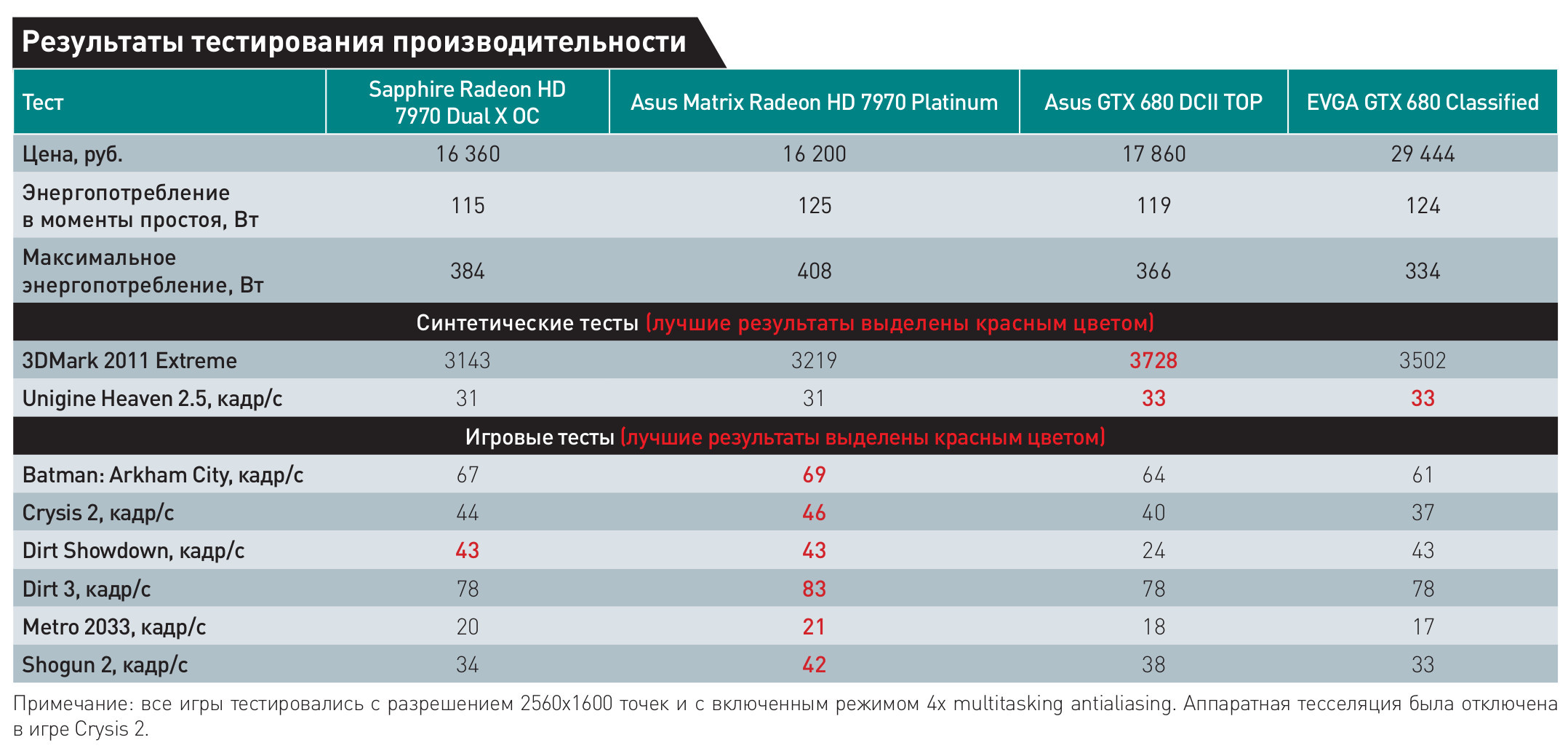 Плата Sapphire Radeon HD 7970 Dual X OC за 16 360 руб. стала победителем с точки зрения соотношения цена/производительность. Однако она потребляет больше энергии и издает больше шума, чем Asus GTX 680 DCII TOP. Лично я выбрал бы плату Asus исходя уже из одного только уровня шума. Графической платы старшего класса, которая работала бы так тихо, мне до сих пор не встречалось. Да и стоит она дешевле, чем EVGA Classified. В игровых тестах победу одержала плата Asus Matrix Radeon HD 7970 Platinum. Но с точки зрения энергопотребления она невероятно прожорлива и издает чуть больше шума, чем другая модель Asus. Таким образом, плата Asus GTX 680 станет прекрасным выбором для тех, кому нужна производительность графического процессора старшего класса и кто желает избежать лишнего шума.