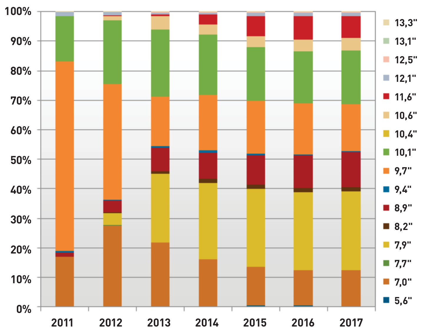 По мнению NPD, планшеты с дисплеями от 7 до 8 дюймов в этом году составят 45% продаж, а 9,7-дюймовые модели -- всего 17%. Объединение 9- и 10-дюймовых моделей в один сегмент несколько сглаживает различие, но миниатюрные планшеты по-прежнему лидируют.