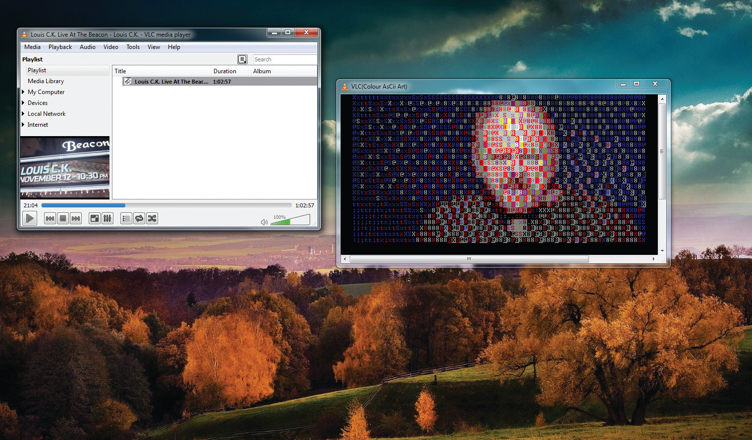 | Преобразование видео (в данном случае на экране Луи Си Кей) в видеоряд ASCII-символов с помощью специальной функции VLC |