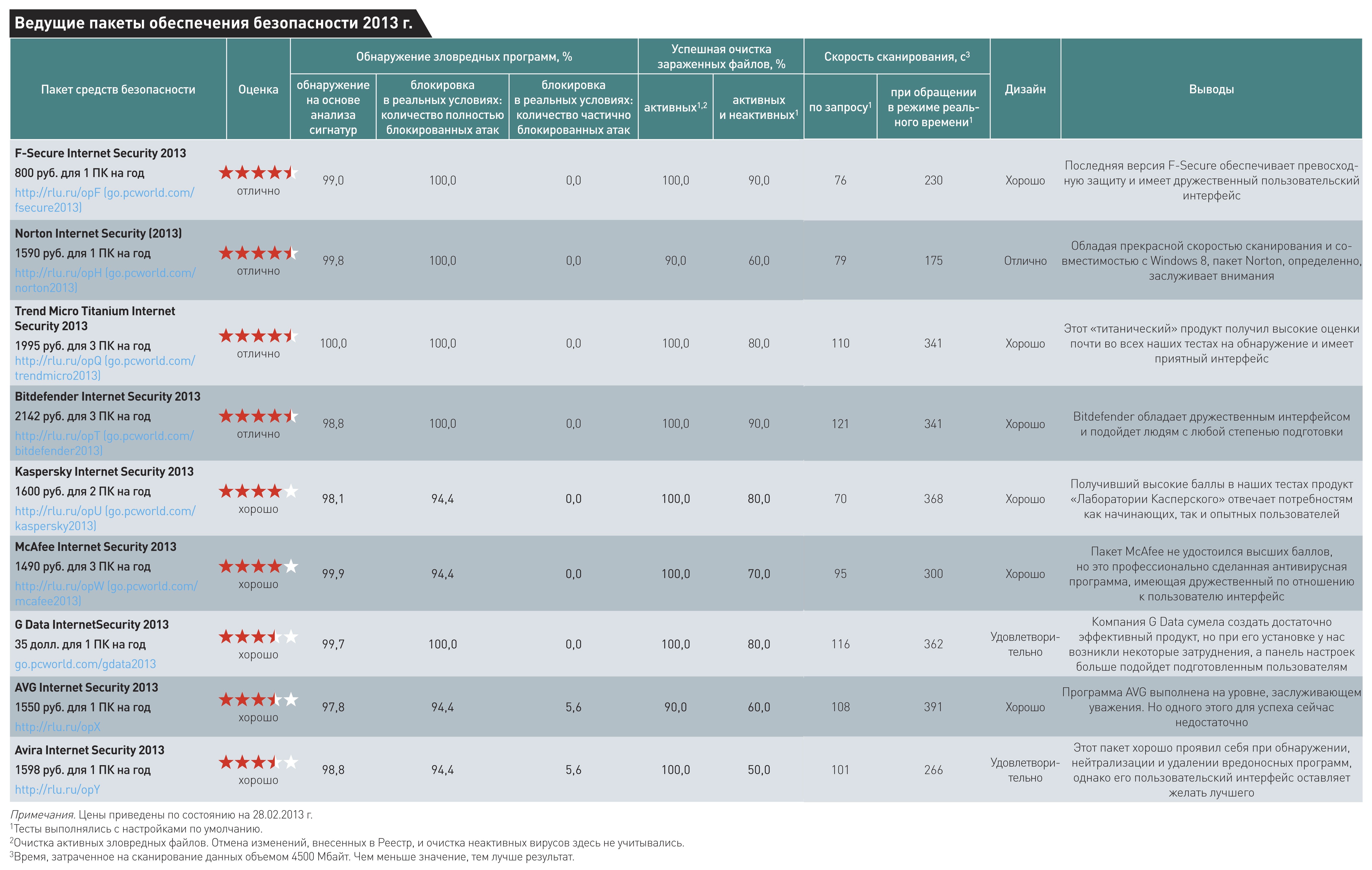 Примечание. Помимо пяти ведущих пакетов, которые будут более подробно рассмотрены ниже, мы протестировали еще четыре продукта, получивших не столь высокие оценки. Это McAfee Internet Security 2013, G Data InternetSecurity 2013, AVG Internet Security 2013 и Avira Internet Security 2013. Полный обзор всех пакетов опубликован по адресу go.pcworld.com/AV2013suites.