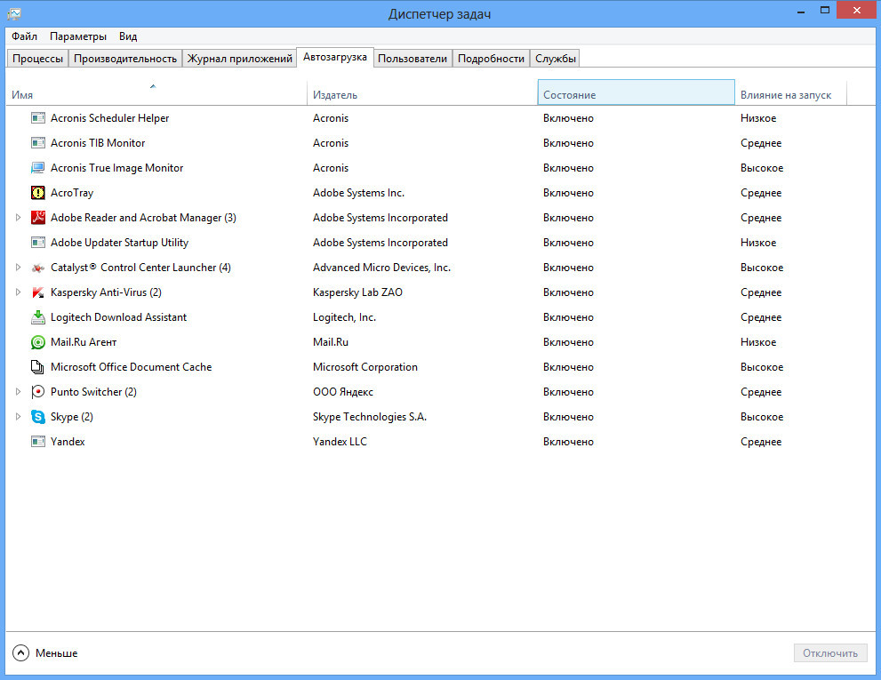 Больше не придется запускать утилиту MSConfig для определения программ, включаемых в автозагрузку. Чтобы посмотреть, какие программы автоматически стартуют при начальной загрузке Windows, достаточно перейти на вкладку «Автозагрузка» в Диспетчере задач Windows 8. Чтобы проделать это, нажмите комбинацию клавиш и выберите из предлагаемого меню пункт «Диспетчер задач» или наберите «диспетчер задач» (без кавычек) в поисковой строке «Поиск». Перейдите сначала на вкладку «Подробнее» в нижней части экрана, затем на «Автозагрузка» вверху и выберите те программы, которые должны автоматически запускаться при начальном старте Windows.