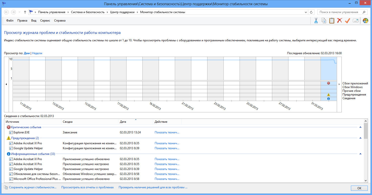 Монитор стабильности отслеживает установку и обновление приложений и драйверов, выдавая пользователю точную информацию о том, когда это произошло. Соответствующие знания помогут вам устранять возникающие неполадки.
