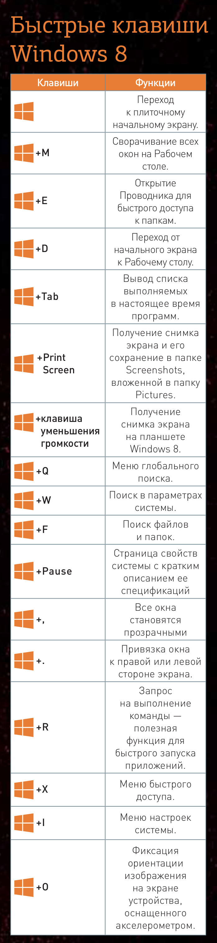 В Windows 8 появилось много новых функций и процедур по сравнению с предшествующей ОС, из-за которых могут почувствовать себя новичками даже самые опытные пользователи ПК. Таков побочный эффект от перехода к операционной системе, предназначенной для работы как с органами сенсорного управления, так и с традиционными мышью и клавиатурой. Но не стоит пугаться. В этой статье мы постарались обобщить все сокращенные клавиатурные команды, приемы и скрытые утилиты, которые помогут совладать с гибридной ОС.