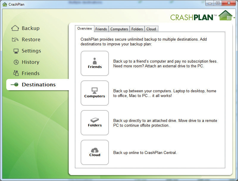 | Утилита CrashPlan предлагает различные варианты резервного копирования файлов |