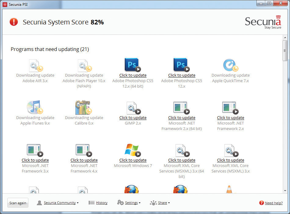 Нажмите большую кнопку Scan. По завершении сканирования вы увидите список программ, установленных на компьютере, а также перечень приложений, для которых были выпущены обновления. Одни из таких приложений утилита Secunia PSI может обновить самостоятельно (и если во время установки вы выбрали вариант автоматического обновления, новые компоненты будут загружаться без какого-либо участия с вашей стороны), другие же потребуют установки вручную. Под каждым обновлением, не выполняющимся автоматически, появится ссылка Click to Update. Щелкните на ней, и Secunia инициирует процесс.