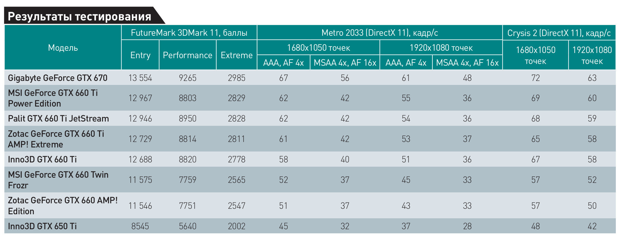 Тестирование завершено. На сей раз значок «Лучшая покупка» по праву заслужила видеокарта Zotac GeForce GTX 660 AMP! Edition, поскольку она имеет отличное соотношение цена/производительность. А вот выбором редакции стала модель MSI GeForce GTX 660 Ti Power Edition — на наш взгляд, она является наиболее оптимальной для тех, кто пытается «выжать» из видеокарты все, на что она способна.
