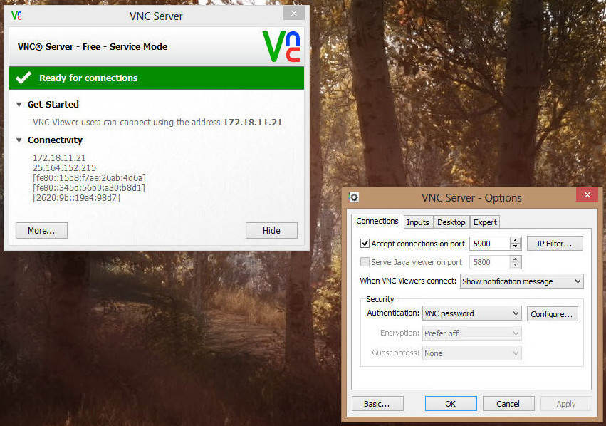 | Программа сервера RealVNC, распространяющаяся бесплатно, проста в установке и предъявляет скромные требования к ресурсам. После запуска сервер VNC работает в фоновом режиме |