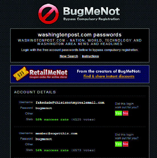 | На сайте BugMeNot публикуется информация об общих учетных записях, созданных для различных ресурсов |
