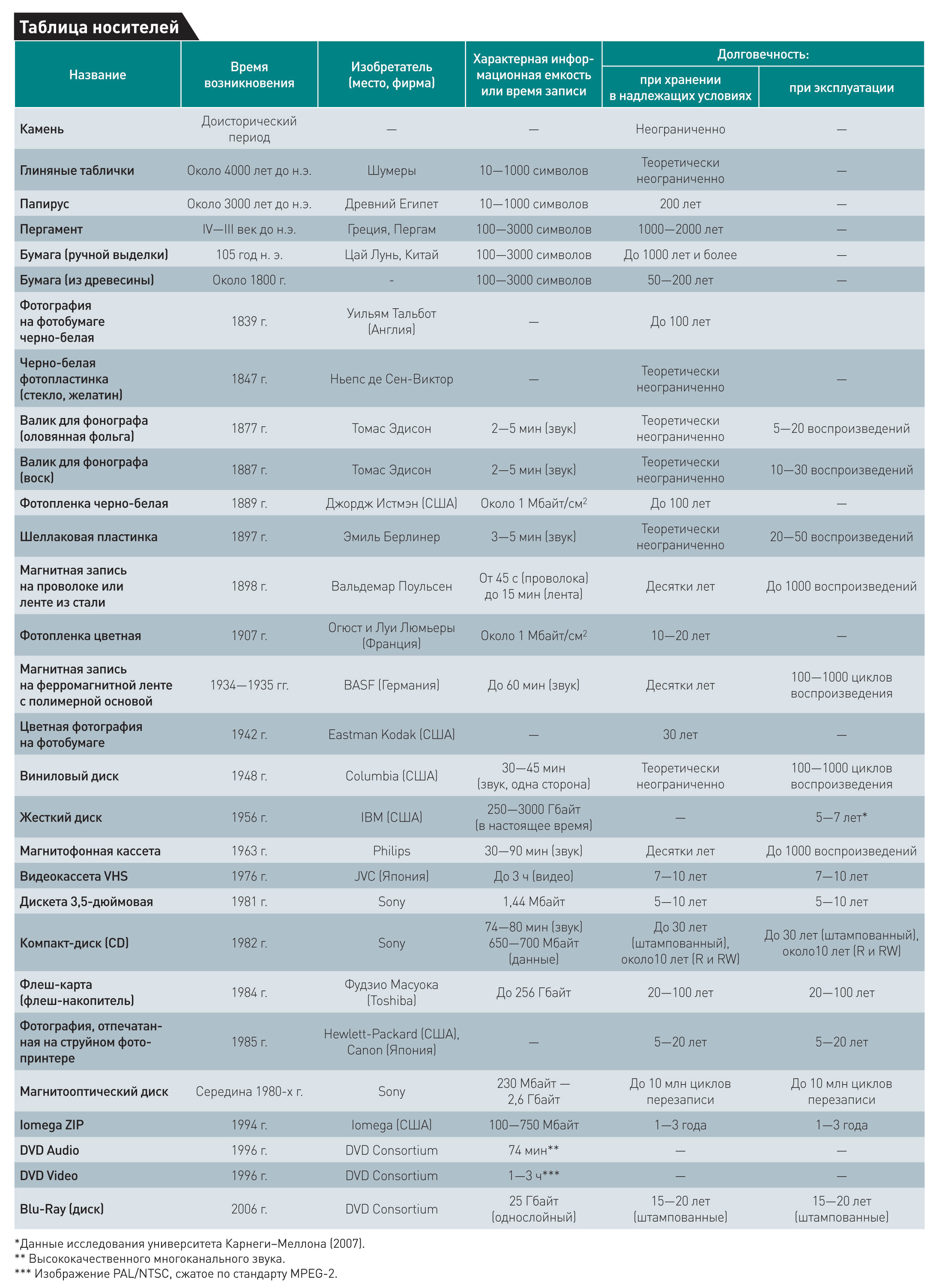 Как ни странно, чем более носитель продвинут с технической точки зрения, тем меньше срок его службы. И данное правило почти не имеет исключений. Книги и рукописи на пергаменте могут храниться тысячелетиями, не говоря уже о глиняных табличках или надписях на камне. Правда, библиотеки, случается, горят, а недавно весь мир увидел воочию, что и камень не устоит, если кто-то захочет целенаправленно уничтожить памятники культуры — в 2001 г. талибы взорвали простоявшие больше полутора тысяч лет Бамианские статуи Будды, оправдав этим поступком в глазах всего мира вторжение западных войск в Афганистан.