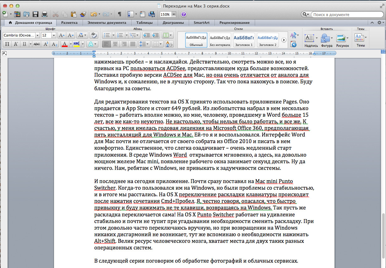 Для редактирования текстов в среде OS X принято использовать приложение Pages. Оно продается в App Store по цене 649 руб. Из любопытства набрал в нем несколько текстов – работать вполне можно, но мне, человеку, проведшему в Word больше 15 лет, все же было как-то неуютно. Не настолько, чтобы нельзя было ничего делать, но все же. К счастью, у меня имелась годовая лицензия на Microsoft Office 360, предполагающая пять инсталляций для Windows и Mac. Ею я и воспользовался. Интерфейс Word для Mac почти не отличается от своего собрата из Office 2010, и писать в нем комфортно. Единственное, что слегка озадачивает, – очень медленный старт приложения. Word в среде Windows открывается мгновенно, а здесь, на довольно мощном «железе» Mac mini, появление рабочего окна занимает около 10 с. Ну да ничего. Нам, ребятам с Windows, не привыкать к задумчивости системы.