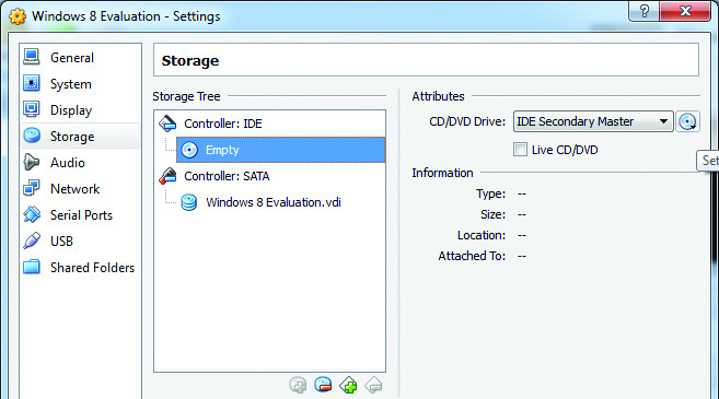 Итак, ваш виртуальный ПК установлен. Поместите инсталляционный диск в виртуальный накопитель. Нажмите Settings и перейдите к параметрам Storage. В дереве Storage щелкните на CD с надписью Empty в разделе Controller: IDE, после чего нажмите кнопку с изображением CD. На экране появится окно браузера файлов. Найдите и выберите ранее загруженный файл Windows 8 ISO. После того как виртуальная машина будет настроена, не перемещайте никуда файл ISO, иначе Windows 8 перестанет работать.