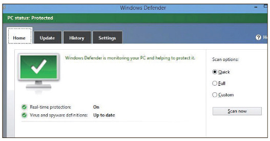 Теперь самое время убедиться, что на вашем ПК нет программ-злоумышленников. Перейдите на вкладку «Обновить» и нажмите кнопку «Обновить», чтобы загрузить последние обновления антивирусной базы. Затем откройте вкладку «Домой» и выберите в списке «Параметры проверки» пункт «Полная». После чего вам остается лишь нажать кнопку «Проверить сейчас» и подождать, пока «Защитник Windows» просканирует ваш ПК на наличие скрытых угроз.