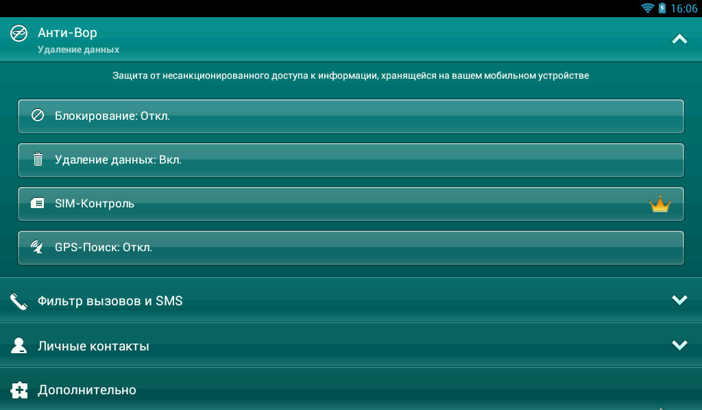 А модуль защиты от кражи предлагает вполне стандартный набор функций. Местоположение гаджета легко отследить на карте и заблокировать в случае необходимости. Осуществляется блокировка всех данных, вплоть до информации на SIM-карте. Также выполняется удаленное манипулирование данными на устройстве: создание резервных копий, копирование и удаление. Кстати, резервные копии дозволяется создавать по расписанию и переносить на другие устройства.