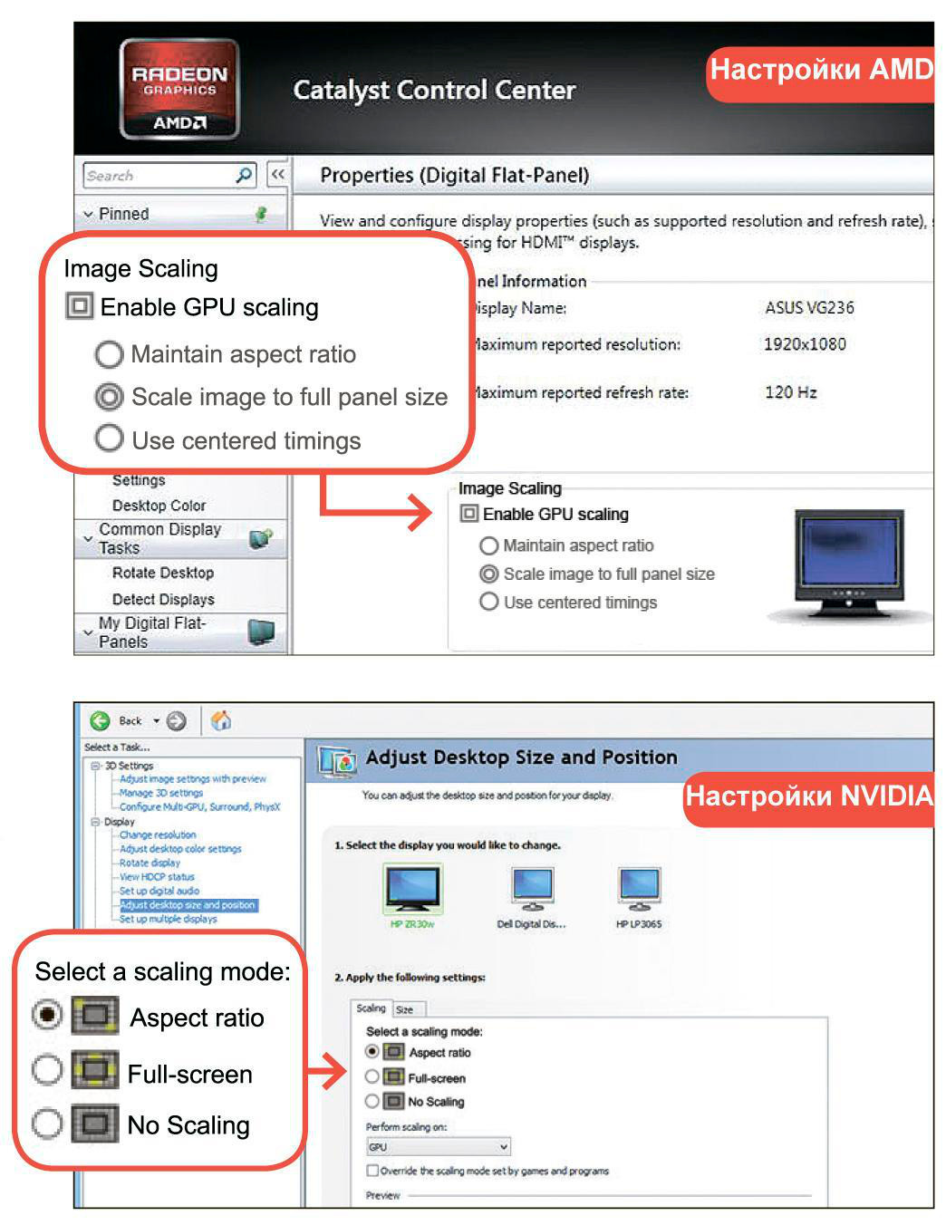 Еще одним ключевым параметром является соотношение сторон экрана. В старых играх и телетрансляциях стандартной четкости использовалось соотношение сторон 4:3 (640x80 или 1024x768 точек). При выводе изображения такой игры на широкоэкранный монитор оно кажется неестественным и растянутым на весь экран. У некоторых мониторов имеются настройки, позволяющие регулировать соотношение сторон экрана, но с помощью Панели управления графическим процессором все можно сделать гораздо проще, гарантировав при этом сохранность настроек и после переключения между дисплеями.